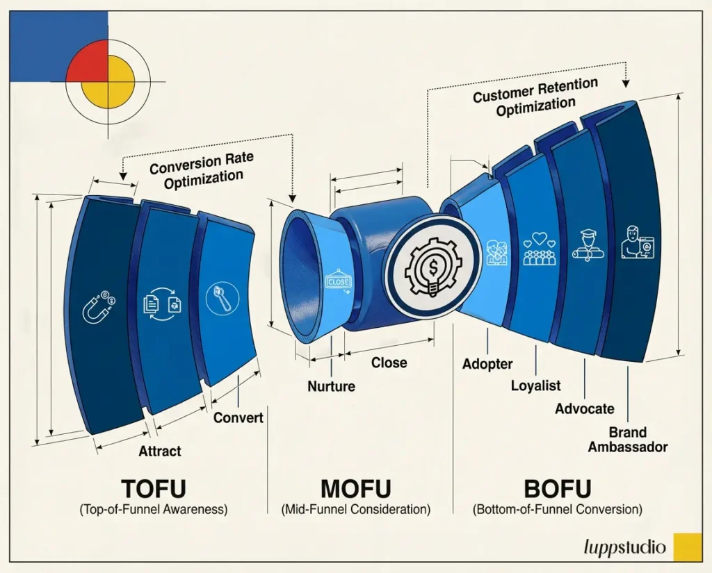 El funnel que vamos a usar: TOFU, MOFU, BOFU, y por qué yo prefiero el enfoque “bow-tie”.